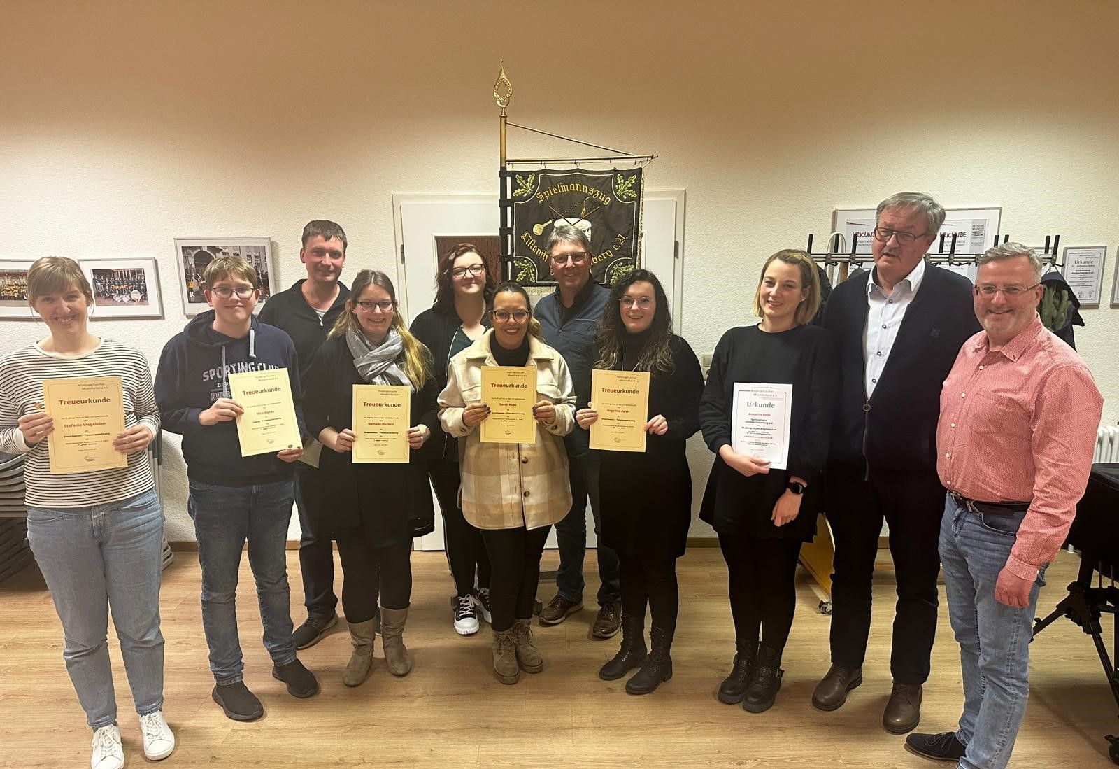Unsere diesjährige Mitgliederversammlung am 03. März war gut besucht und stimmungsvoll. Claus Ströh begrüßte die Mitglieder und führte zügig durch die Tagesordnung. Die Auftritte 2022 haben wir nach der Corona-Durststrecke gut gemeistert, auch, wenn wir leider einige wenige nicht wahrnehmen konnten. Ein besonderer und erfolgreicher Auftritt liegt 2022 hinter uns. Mit recht kleiner Besetzung haben wir uns bei den Rasteder Musiktagen für die Deutsche Meisterschaft wie auch die kommenden beiden Weltmeisterschaften qualifiziert. Wir haben im 2. Halbjahr 2022 ein neues Nachwuchskonzept initiiert. Über die Instrumenten-AG, einem Angebot für die Nachmittagsbetreuung in Grundschulen, haben wir in der Grundschule Falkenberg sechs junge Flötistinnen und Flötisten für die instrumentale Musik begeistern können. Nun gilt es, die Kinder und den Verein zusammenzubringen. Auch für unseren normalen Übungsbetrieb konnten wir sechs junge Musizierende gewinnen, die wir montags jetzt an den unterschiedlichen Instrumenten ausbilden. DER GEMEINSAME SPASS wird auch nicht zu kurz kommen. Unsere Jugendleiterin Anncatrin hat bereits einiges an Aktivitäten geplant. U. a. werden die Kinder zum LaserTec nach Bremen fahren. Im Herbst werden wir mit dem gesamten Verein nach Hamburg fahren und das Musical König der Löwen ansehen. Für die Nachwuchsarbeit haben wir von einigen Lilienthalern und Lilienthalerinnen sowie von örtlichen Unternehmen GROSSARTIGE SPENDEN erhalten. Hierfür können wir uns kaum genug bedanken!! Schließlich wurden noch langjährige aktive Mitglieder geehrt. Unsere drei Vorsitzenden, Claus Ströh, Stefan Meyerdierks und Frank Hartenberger gratulierten und überreicht Urkunden wie Ehrennadeln für Mitgliedschaften bis zu 30 Jahren an: Stefanie Wegeleben, Nico Hanke, Florian Wachtel, Nathalie Murken, Janike Meyerdierks, Sarah Roba, Angelina Naurath und Anncatrin Ströh! Mit einem lachenden und einem weinenden Auge freuen wir uns für drei Leistungsträgerinnen unseres Vereins, die Familien-Nachwuchs erwarten! Eure neuen Aufgaben werden spannend werden :) Leider werdet Ihr uns fürs Erste sicher das ein oder andere Mal fehlen!